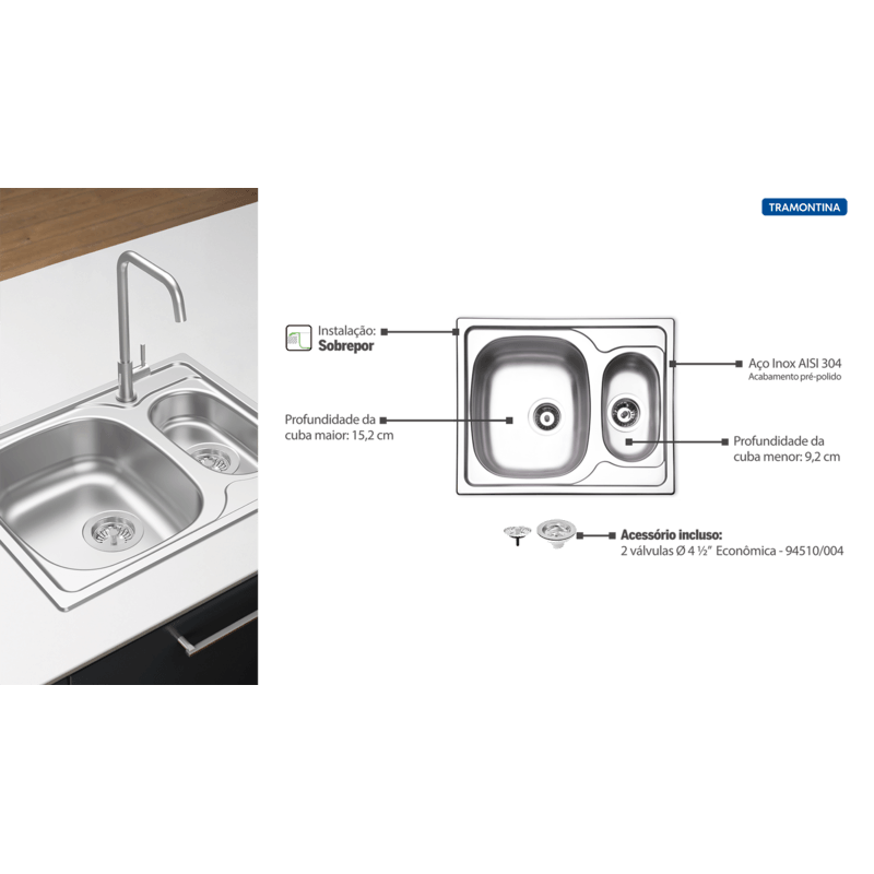 Todo el mundo busca artículos prácticos para su cocina que la dejen mucho más bonita. Pensando en eso, decidimos desarrollar la Bacha de Superponer Tramontina Vega 1.5C 34 R Bacha a la Izquierda de Acero Inoxidable, con Terminación Natural y válvula, 62 x 50 cm, con dos bachas.Totalmente fabricada en acero inoxidable con terminación natural, tiene dos bachas: una principal, de 15,2 centímetros de profundidad, ubicada a la izquierda y una bacha auxiliar, ubicada a la derecha, de 9,2 centímetros de profundidad. Es muy fácil de instalar y viene con 2 válvulas de 4 1/2'' de diámetro y tiene perforación para el grifo. Garantiza ya la tuya y deja tu cocina mucho más práctica. Instalación: EmpotrarFregadero: Simple + AuxiliarCapacidad: 15,5 + 3 LMaterial:- Acero inoxidable AISI 304- Espesor: 0,6 mmTerminación: NaturalProfundidad de el fregadero: 15,2 cm + 9,2 cmPerforación para grifo: SíAccesorios incluidos:- Kit de instalación- 2 válvulas 4 1/2''Manta adhesiva anti-ruido: síTodas las imágenes son sólo para fines ilustrativos. Para un perfecto funcionamiento del fregadero, montar inicialmente la válvula y, después, fijar el fregadero al mueble, conforme folleto de instrucciones que acompaña el producto.Remover la etiqueta pegada en el fregadero.Limpiar la pieza con detergentes normales neutros.Usar solamente esponja blanda o paño para lavar el fregaderoEsta pieza tiene bordes cortantes. Manejar con cuidadoNo usar ácido muriático, agua sanitaria o cualquier otro solvente para lavar objetos en el fregadero.-En la reforma o construcción, proteger el fregadero para no dejar sobre la pieza polvo de cemento o yeso.Enjuagar y secar bien después del uso.Nunca dejar objetos metálicos sobre la pieza por período muy largos, para evitar la corrosión.Paramantener el brillo de su fregadero recomendamos el uso del removedor de manchas Tramontina. Garantía contra cualquier defecto de fabricación por un período total de 120 (ciento veinte) meses.Plazo de garantía disponible en Certificaciones / Normas.