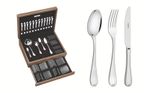 Las piezas se arreglan en un bello estuche de madera MDF. De acero inoxidable, altamente durable, mantiene las características originales, preservando la belleza, la higiene y la durabilidad del material. Cucharas con cuenca en formato simétrico y bordes cuidadosamente redondeados. Tenedores con dientes pulidos en la parte interna, con formato apropiado para la boca y bordes redondeados para proporcionar más comodidad en el uso. Cuchillos totalmente templados, que le garantiza mayor durabilidad al filo de corte y mayor resistencia a la corrosión y, por su característica de templabilidad, no araña la porcelana. Terminación en alto brillo, con detalles en el mango. Servicio de mesa y postre. Se pueden lavar diariamente en lavavajillas.Material: acero inoxidable.Estuche de madera MDF.