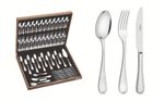 Las piezas se arreglan en un bello estuche de madera MDF. De acero inoxidable, altamente durable, mantiene las características originales, preservando la belleza, la higiene y la durabilidad del material. Cucharas con cuenca en formato simétrico y bordes cuidadosamente redondeados. Tenedores con dientes pulidos en la parte interna, con formato apropiado para la boca y bordes redondeados para proporcionar más comodidad en el uso. Cuchillos totalmente templados, que le garantiza mayor durabilidad al filo de corte y mayor resistencia a la corrosión y, por su característica de templabilidad, no araña la porcelana. Terminación en alto brillo, con detalles en el mango. Servicio de mesa y postre. Se pueden lavar diariamente en lavavajillas.Material: acero inoxidable.Estuche de madera MDF.