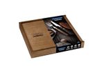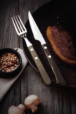 Láminas de acero inoxidable. Las láminas tienen mayor durabilidad del filo debido al tratamiento térmico. Las láminas de los tenedores tienen más espesor y un estampado del acero que garantiza más resistencia, evitando deformaciones. Los mangos de madera tratada Polywood son resistentes a impactos y alta temperatura, garantizando más resistencia y durabilidad. Remaches de acero inoxidable. Estuche de madera que le ofrece una protección a las piezas, permitiendo el transporte y almacenaje con más seguridad. Se pueden llevar al lavavajillas facilitando tu día a día.