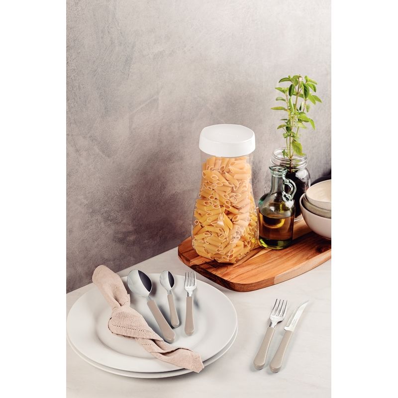 Láminas de acero inoxidable.Láminas de los cuchillos tienen más durabilidad del filo, gracias al tratamiento térmico. Tenedores y cucharas que garantizan mayor resistencia, gracias al espesor del acero y al estampado de las láminas. Mangos de polipropileno con más resistencia y durabilidad. Se pueden llevar al lavavajillas facilitando tu día a día.Deja tu mesa mucho más bonita y llena de estilo con el juego de cubiertos Tramontina Leme con láminas de acero inoxidable y mangos de polipropileno gris 20 piezas. Perfecto para el uso diario, tiene piezas fabricadas con láminas de acero inoxidable de alta resistencia y durabilidad debido al tratamiento térmico y espesor especial. Los mangos son de polipropileno y proporcionan un manejo supercómodo, además de dejar la composición de tu mesa mucho más elegante, debido al color gris. Además el juego de cubiertos es muy fácil de limpiar y se puede llevar al lavavajillas, facilitando tus tareas en la cocina. Con Tramontina, tienes los mejores cubiertos para tu casa.
