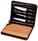 Las láminas de los cuchillos, los tenedores y la pinza son de acero inoxidable. Las láminas de los cuchillos tienen un hilo más duradero, gracias al tratamiento térmico. Las láminas del tenedor y la pinza cuentan con mayor espesor y un acero estampado que garantiza mayor resistencia, lo cual evita las deformaciones. Afilador con eje de acero carbono revestida de cromo duro que garantiza una mayor durabilidad y precisión en el afilado. Los mangos de madera tratada Polywood son resistentes a impactos y altas temperaturas, lo que garantiza mayor resistencia y durabilidad. Remaches de aluminio. Tabla de corte de madera ideal para cortar y servir. Estuche sintético que proporciona protección a las piezas, además de permitir transportarlas y guardarlas con mayor seguridad. Son aptas para lavavajillas, lo que facilita su rutina diaria.