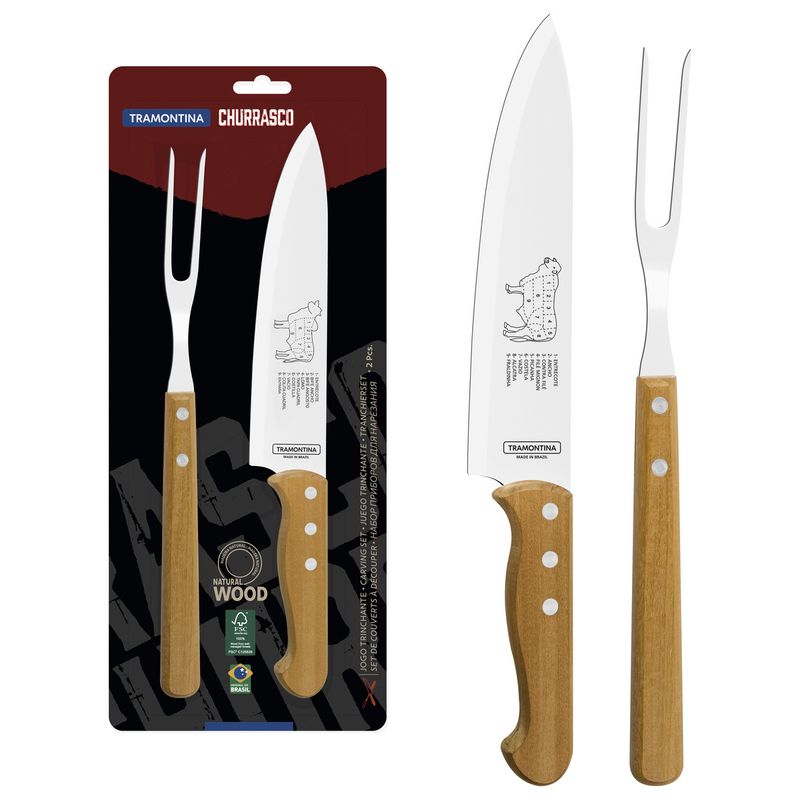 Lámina de acero inoxidable. La lámina del cuchillo tienen mayor durabilidad del filo, gracias al tratamiento térmico. La lámina del tenedor tiene más espesor y un acero estampado que garantiza más resistencia, evitando las deformaciones.Mango de madera natural con remaches de aluminio.El asado de su casa nunca estuvo tan completo. Con el juego trinchante Tramontina para asado con láminas de acero inoxidable y mangos de madera natural, 2 piezas, servir a sus invitados será todavía más práctico y sabroso. El cuchillo y el trinchante del juego tienen láminas de acero inoxidable y características únicas. El cuchillo de ocho pulgadas garantiza más durabilidad del filo de corte debido al tratamiento térmico y el tenedor cuenta con más espesor y un estampado del acero que garantiza más resistencia. Son dos productos especiales que además embellecen la hora de servir. Con mango de madera natural, llevan más comodidad y bienestar al momento de servir el asado.