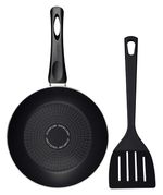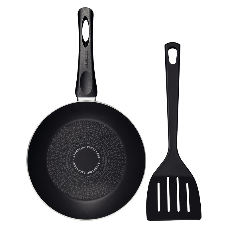 Cuerpo de aluminio con espesor de 2,3 mm, que brinda una cocción rápida y uniforme. Revestimiento interno y externo de antiadherente Starflon Excellent, que no deja que se peguen los alimentos y es fácil de limpiar, más durable y no perjudicial para la salud, ya que está libre de PFOA.Mango de baquelita antitérmica que ofrece seguridad durante el manejo. Espátula de nylon que permite uso a temperaturas hasta de 180 °C y mango con agujero que permite colgarlo en tu cocina.Se puede llevar al lavavajillas facilitando tu día a día.